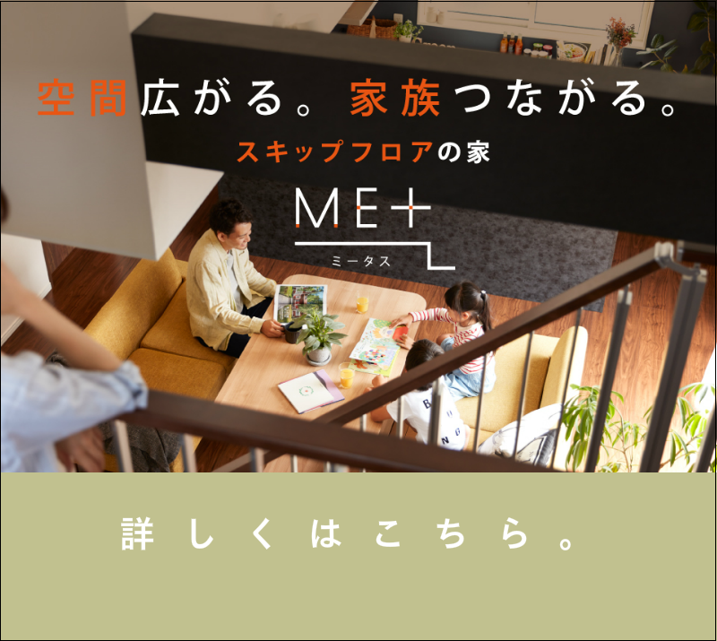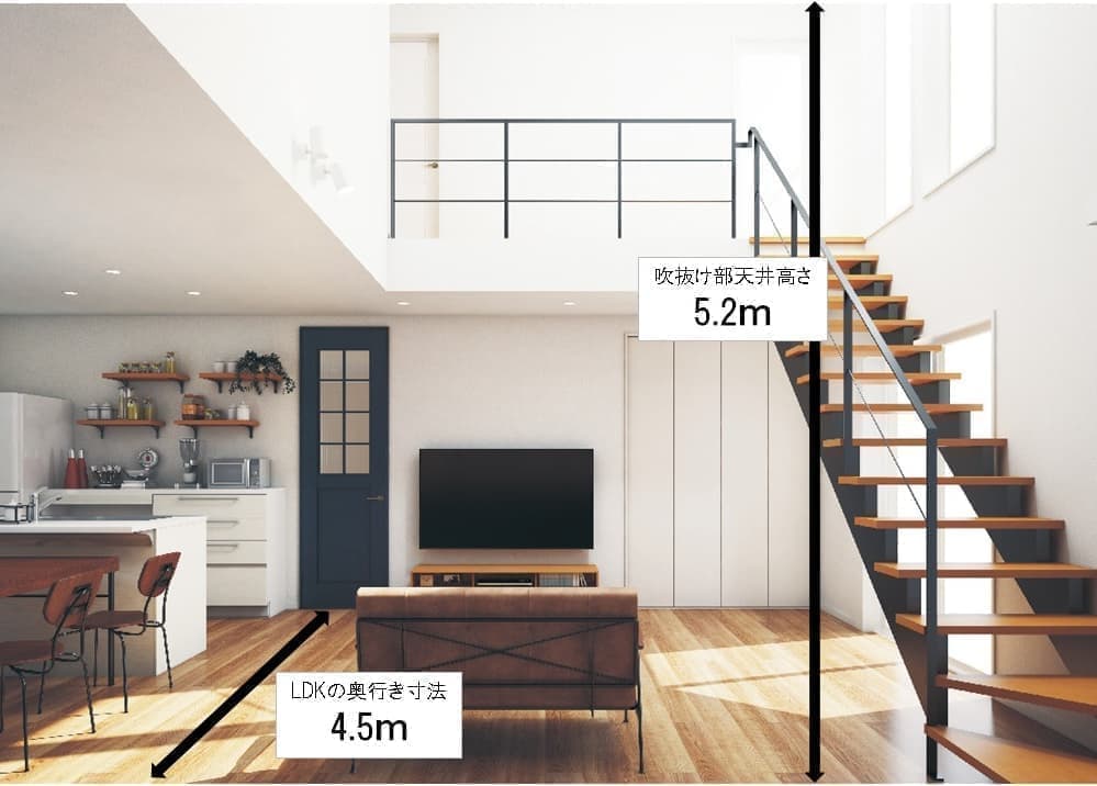 ワイドスパンの吹抜けリビング。テクノストラクチャーだからできる明るくて気持ちのいい空間。天井高さ5.2mの吹抜け。木造住宅では難しい柱のない奥行き4.5mの空間。地震に強く、耐震等級3で実現します。